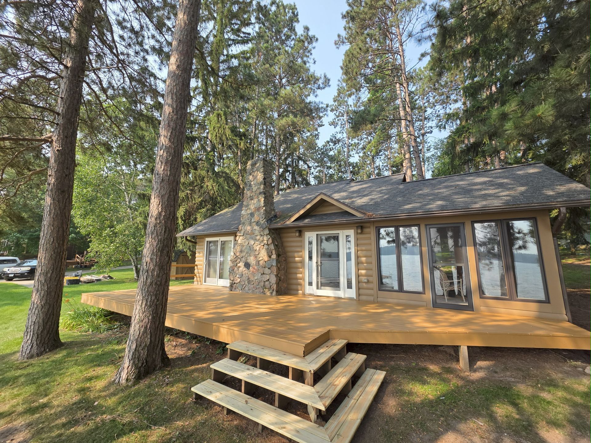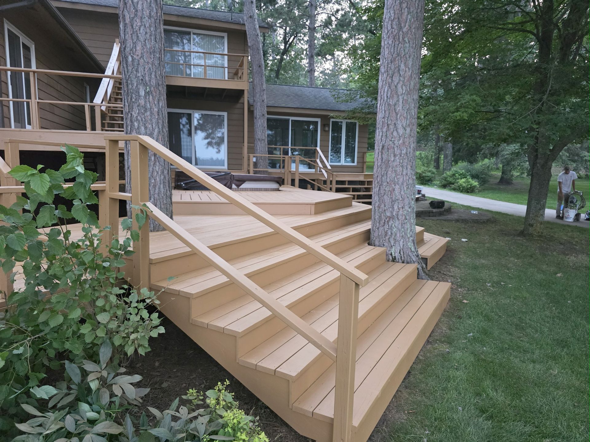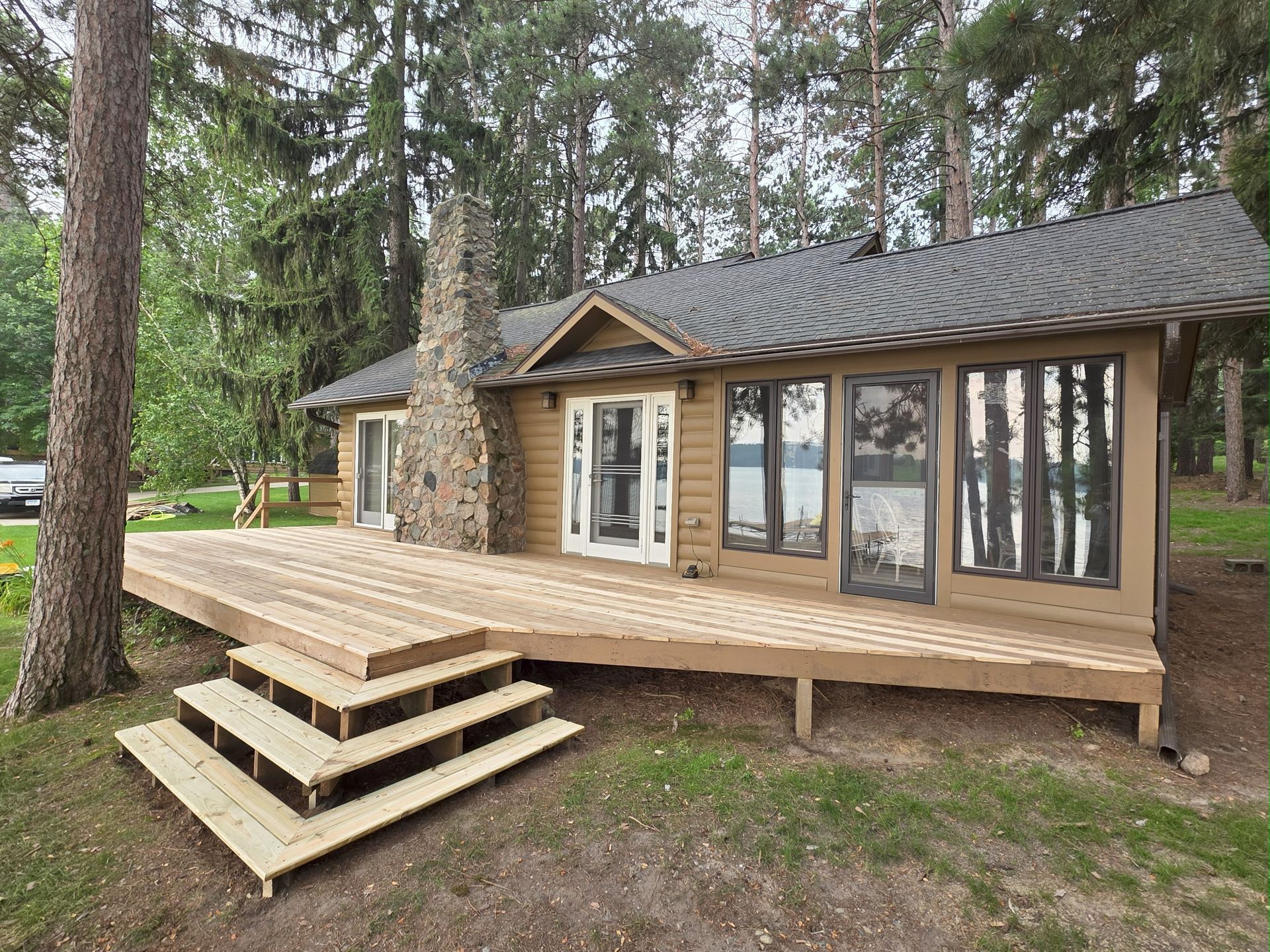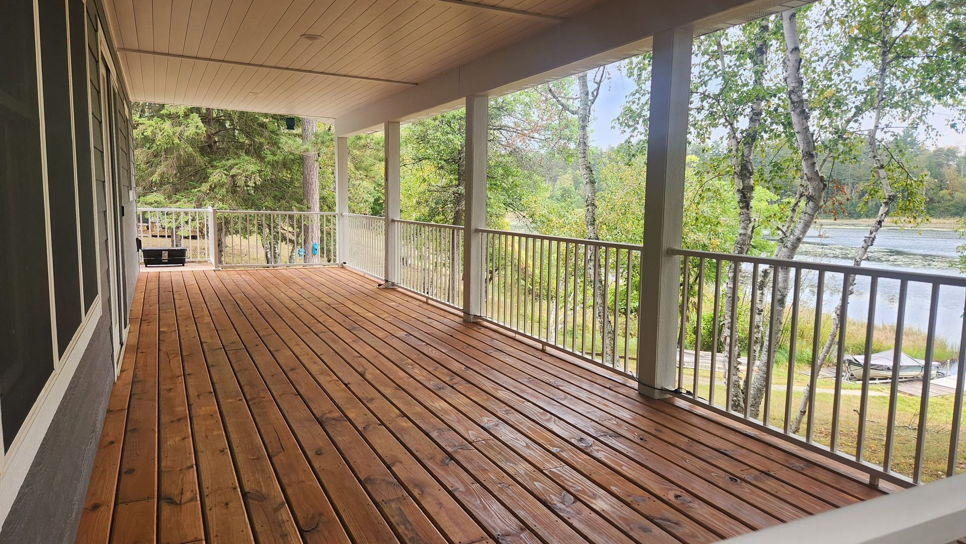 This deck and cabin needed some help so we replaced some rotting boards and applied a solid stain finish to protect it and give the deck some life and a few more years of use!.